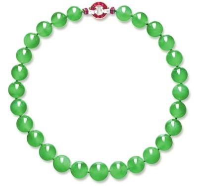 除了质量非凡的翡翠玉珠之外,此项链更体现了卡地亚上世纪初发挥得淋漓尽致的装饰艺术(ArtDeco)风格,为人津津乐道。当时翡翠在西方国家崭露头角,部分高级珠宝商如卡地亚旋即在其创新的设计中倾注刻面翡翠的元素,表现出另一个层次的奢华。当时卡地亚为此串翡翠珠链设计了红宝石镶钻链扣,其简洁的几何形状和大胆的红绿颜色对比,充分体现了二十世纪初的装饰艺术风格,也凸显了翡翠优雅的韵味,瑰美动人;而红色在中国文化中象征吉祥喜庆,为这翠绿翡翠珠链锦上添花。