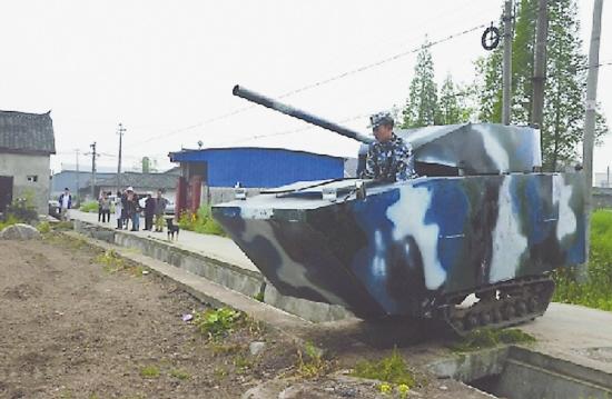 曾在青岛当海军的退伍军人简林动手为6岁儿子制造了一辆3吨重坦克模型!炮塔可360度旋转,炮筒高低可调,还能模拟炮弹声音,“坦克”侧面有个门,方便儿子进出。9日下午,绵竹市茶店子村的菜地里,简林为“坦克”试车。据悉,儿子的小坦克坏了,总让买新的,于是简林网上找到一辆国产水陆坦克的图片,按照比例山寨了一辆。