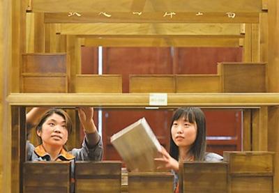 4月15日,一套原大原色原样复制的《四库全书》(文津阁本)运抵江苏扬州天宁寺万佛楼,并将于18日对外展出。这套《四库全书》(文津阁本)共3.6万余册,由商务印书馆出版,从数码拍摄、数据修正、试制、正式生产到完工,前后历时十余年。图为工作人员在摆放《四库全书》。