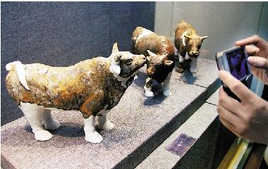 4月16日,一名参观者在扬州博物馆的隋炀帝墓出土文物特展上欣赏“陶牛”。当日,展期三个月的“流星王朝的遗辉——隋炀帝墓出土文物特展”在江苏省扬州博物馆开展。这是“2013年度全国十大考古新发现”之一的隋炀帝墓出土文物首次公开亮相,展出隋炀帝墓及萧后墓出土文物百余件。 (赵军 摄)