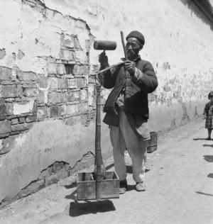 如其中的一张照片中,一个留着长长胡须的民间商人,肩上挑着一根长扁担,扁担两头各有一个木头做的小箱子,箱子里装的什么东西照片中无法看清,但很多老南京对商人手中拿着的类似于鼓一样竹筒做的东西,却印象非常深刻。在他们的儿时记忆里,每当听到民间商人敲打竹筒的声音,他们就会飞快跑出家门,手里拿着积攒的废铜烂铁,来换商人扁担里的糖果等小商品。