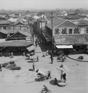 说起章云板鸭店,老城南居民没有不熟悉的,你知道吗,搬迁前的章云板鸭店就位于这张图片中的美盛纸号旧址。从这张照片中可以看出,升州路口美盛纸号几个大字依稀可见,其建筑属于现在苏北农村地区比较常见的二层砖木结构,由于照片是黑白色,无法分辨出所用砖头是红色还是青色,但从照片远处情景可以看出,当时美盛纸号公司所采用的建筑形式在南京比较普遍。