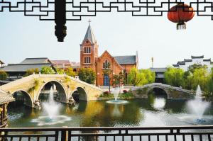 这是台儿庄古城在原址复建的基督教堂及民居。(新华社发)