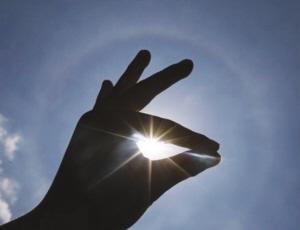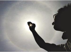 与此同时,不论是在微博上还是微信朋友圈里,大家都在争相“晒”出中午时分的“彩虹”照片。记者看到有的人打出了OK的手势,大拇指和食指正好把太阳圈在里面,而其余手指稍稍弯曲。远远看去,好似发光的孔雀开屏。