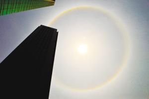 也有的人选取不同角度,把太阳和高楼结合在一起,好似高楼大厦上出现了光环一般。还有的人把手指伸向了天空,中指翘起,好似在天空中戴了一枚闪闪发光的钻戒。不论是哪种拍摄姿势,哪个角度,突然出现在天际的“彩虹”都让市民又惊又喜。