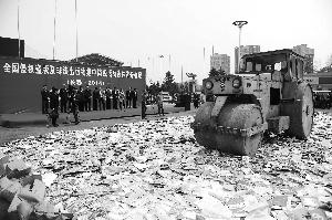 4月24日,吉林举行2014年吉林省侵权盗版及非法出版物集中销毁和“绿书签行动”系列宣传活动,现场集中销毁了一年来查获的侵权盗版及非法出版物65万件。新华社发