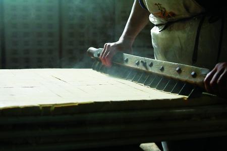 熊礼华的厂里,工人正在切豆腐块。