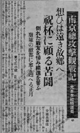 特派记者光本在《大阪每日新闻》奈良版上报道了侵入南京的日军3日内打死8.5万人的战况。报道详细描述,经日军助川部队和海军“扫荡”后,从下关码头最近的一条街到扬子江下游尸体绵延二三里远。光本还写到,日军某部部队长“在国民政府三楼大厅,率众三呼万岁,举杯致辞称,我们占领了一国之都,并赶走了它的政府,掌握了这里的政权,这是一件非常荣耀的事。”在报道的结尾部分,光本写到,“城外的扫荡仍在继续,看来他们将在废墟南京城内迎接新年的到来了”。这些记录,赤裸裸地暴露出日军将中华六朝古都南京夷为废墟,并以占据别国首都为荣的强盗行径。这份由日本战地记者随军采写的战况实录,是日军在南京实施大屠杀罪行的直接佐证。