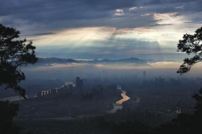 第一张,雨刚停,整个福州像被水洗过一样,画面清澈无比,水汽还未散去,化作云雾弥漫在空中,将地上的高低建筑笼罩。浓密的乌云,层次分明,阳光则在云层间寻找突破口,一道道光柱从间隙散射而出,照射着福州大地。