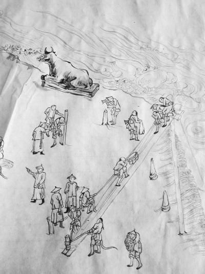 “这是我正在创作的《康乾治河图》,内容是清代康熙年间,淮河发大水,邵伯灾情严重,康熙皇帝南巡监督治水的故事。”丁永祥介绍,根据史书上记载,邵伯斗野亭里的铁牛,是康熙随船带来治水的。