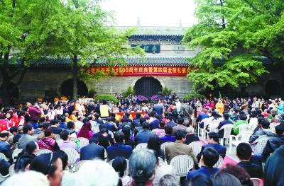 昨天,“灵谷寺开山1500周年庆典暨第四届金陵礼佛文化月开幕式”在灵谷公园无梁殿前举行。佛音缭绕、钟声悠扬,众多南京市民共同见证了南京的佛教史盛会。据了解,始建于梁天监十四年(515)的南京灵谷寺,今年迎来1500岁生日。记者 崔晓摄