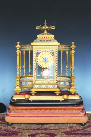 铜珐琅八柱方钟,清道光,为铜镀金錾铜胎珐琅工艺。器型呈半月形,色彩鲜艳,工艺精湛。屏风中间一段呈亭式有二针二套钟,即走时和打钢条报时。表盘上只有时圈,而没有分圈,垂铜珐琅可调式圆摆。