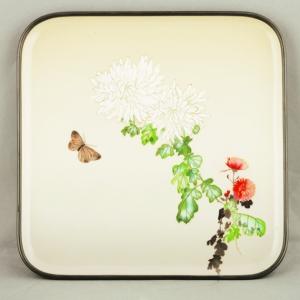铜胎珐琅菊花盘,铜胎珐琅菊花盘器形正方,产自日本,铜胎,施珐琅釉彩,盘面为菊蝶图——洁傲的白菊、浓艳的红菊、振翅的蝴蝶,盘底为樱花锦地,并落款“魁”字。