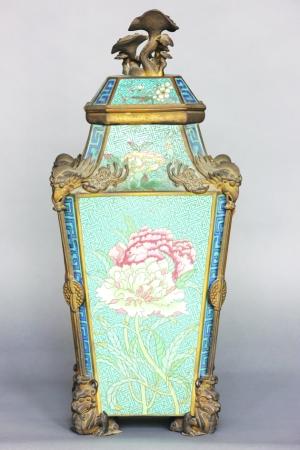 铜胎掐丝珐琅花卉方罍,铜胎,采用掐丝起线工艺,通体以蓝色珐琅釉料饰万字锦地,以各色珐琅彩釉饰牡丹花纹,顶部装饰灵芝造型,肩部及足部均装饰异兽,胎体轻薄、器型规整、掐丝匀称、制作精细。