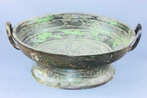 龙纹盘(十八鱼纹),周代,撇口、浅腹、高圈足、双立耳。盘内壁铸有18条鱼纹,内底铸夔龙夔凤纹。整体造型独特精巧,纹饰繁缛华丽。