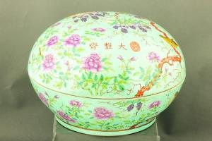 永庆长春款绿地藤萝花瓷盒(大雅斋款),清同治,瓷盒由盒体和盒盖组成,于天青色色地上彩绘藤萝花鸟图案, 盒盖顶部落“大雅斋”三字横款,钤红彩图章款“天地一家春”。