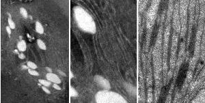 这一成果的主要发现者王鑫介绍,他们是通过光学显微镜、扫描电镜和透射电镜综合观察,经过数年的研究,在莲叶化石的细胞残余中发现了叶绿体的“身影”。“叶绿体呈扁球状,厚约1微米,直径约2微米。片层结构是叶绿体的特有特征。”王鑫说,“叶绿体在显微镜下放大几万倍,大概手掌心大小,就可以看到叶绿体中的基粒,这些基粒的膜像千层饼一样,叠成一摞又一摞,叶绿体中的膜之间还夹藏着淀粉粒。”