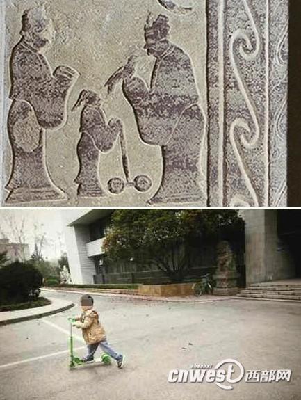近日,当网友“六六他娘”带着儿子去碑林参观时,在一块东汉画像石上,也发现了一件“滑板车”,从时间上看,要比德国人发明早了近两千年。
