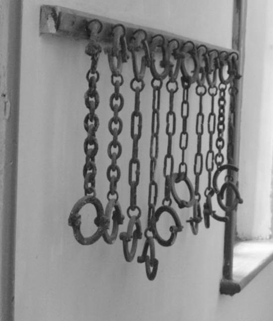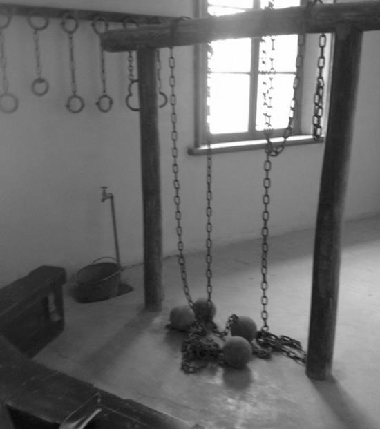 当年一座阴森森的房间被关押者诅咒为鬼门关,它是检身室,就是进行人身搜查。在这个监狱,当年一共有三座这样的检身室。每天早晨,被关押者从牢房里出来,需要经过这里,把衣服脱光,挂在两旁的衣服架上,然后走到木杠子前面,举起双臂,抬腿跨过木杠,同时嘴里还要大喊自己的编号。