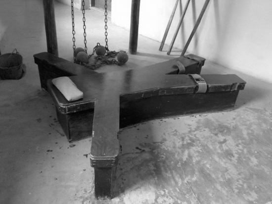 在这一时期还有一种野蛮的刑罚,被称为“笞刑”,也是专门针对中国犯人使用的。执行笞刑所使用的刑具是一种特制的竹鞭,由两片竹子用细麻绳捆在一起。犯人被绑在“火”字型刑具上,抽打臀部。几竹鞭打下来便会皮开肉绽。在执行“笞刑”时,若一次行刑犯人无法坚持下来,则先行带回监牢养伤,待身体好转后继续执行。