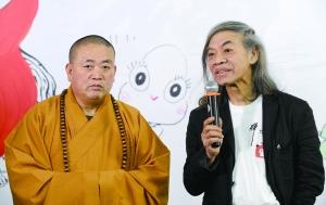 图为少林寺方丈释永信(左)和台湾漫画家蔡志忠在《功夫少林寺》3D动画电影发布会现场。