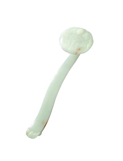 其中,最引人关注的一件当属“清嘉庆白玉御题诗文吉庆有余如意”。如意由整块和田白玉雕琢而成,质地光润,略带皮色。所雕吉罄、双鱼、蝙蝠、万字等纹饰,体现了“图必有意,意必吉祥”的清代宫廷审美标准。如意用工极精,线条洗练顺畅,为典型清代中期宫廷玉雕风格。如意曲柄正面题刻嘉庆帝御制诗文:“象形选良玉,如意兆休征。追琢体无玷,贞坚质有恒。从心荫五谷,应念祝三登。温润辉旁达,含章瑞采凝。”后属“嘉庆丁丑新正御题”款及“会心不远”、“德充符”篆文印二方。此首御制诗收录于《清仁宗御制诗文集·三集》卷四十一,是嘉庆皇帝于嘉庆二十二年(丁丑年)正月所作。与之同类者,另有故宫博物院所藏的一柄白玉如意,与此形制相同,如意首图案及曲柄御制诗有所区别。