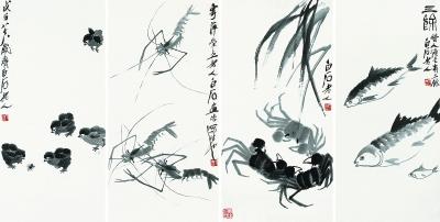 齐白石画鱼、虾、蟹、鸡、虫,当作是有生命、有情感的人来画的,几只小鸡就是两个今日吵架明日和好的孩子。其画作不仅是拟人的,而且倾注了情感,也是齐白石的精神寄托,从中最能看出齐白石对儿童生活的怀恋。在这类作品里,可以看到齐白石从根子里所保持的民间艺术风味不仅是拟人化的,而且充满了艺术幽默。近现代书画专场,作于1948年的齐白石《绘画集珍》,四帧绘画惟妙惟肖,物象生动跃然纸上。这件作品原属北京市文物公司旧藏。