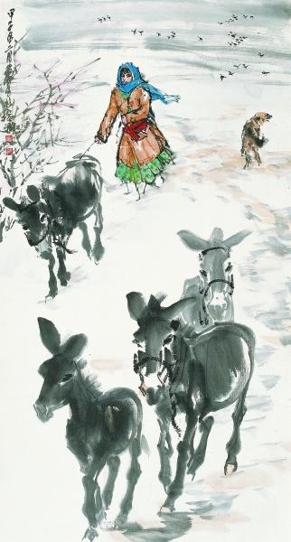 黄胄的人物画总是伴随着丰富而生动的艺术场景。这与他长期“扎根生活”有关,“生活为我出新意,我为生活传精神”。黄胄的边疆人物画根植于生活,为我们营造了一个质朴、清新、欢乐的天地。此次上拍的黄胄1984年创作的《赶驴》,就是其绘画成熟时期的代表作品。少数民族人物、风雪夜、驴都是黄胄一生颇有灵感又得心应手的创作元素,本幅作品中几项元素的集合,迸发出新的火花。画中人物形象很美,营造出风雪天牧女赶驴归家的不易与辛劳,反映出特定时代人物的精神风貌。
