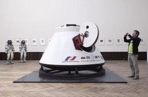 5月5日,在比利时布鲁塞尔,一名男子在一艘苏联时期的太空舱前拍照。