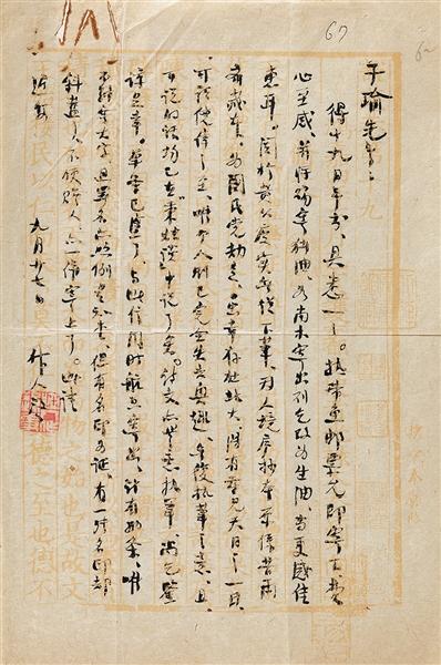 子瑜先生:得十九日手书,具悉一一。热带鱼邮票允即赐下,费心至感,并赐寄猪油,如尚未寄出则不乞改为生油,当更感佳惠耳。关于黄公度实无从下笔,因《入境庐》抄本原系苦雨斋藏本,为国民党劫走,虽幸存在北大,得有重见天日之一日,可说侥幸之至。唯个人则已完全失去奥趣,无从执笔之意,且可说的话均已在《秉烛谈》中说了矣。诗文亦无意执笔,尚乞鉴谅是幸。单条已涂了,与此信同时航空寄出,计有两条,唯不能寄大字,且署名亦照例是知堂。但有名印为证,有一张名印却斜盖了,不便赠人,亦一并寄上了。此请近安。九月廿七日,作人启。钤印:哑人作通事