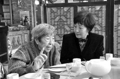 2012年5月,梅娘(左)和女儿柳青回到吉林老家。人民文学出版社供图