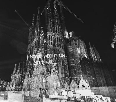 5月4日,法国马赛艺术家菲利普创作了一组特殊的作品,可以使人像、文字出现在城市的任何一个角落,他把这组作品称为“灯光画”。
