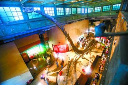 从四楼气窗看展示恐龙化石的大厅,恐龙化石旁人流不止,闪光灯不断。 均杨眉 摄
