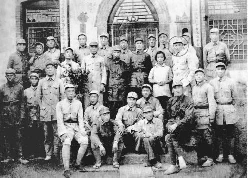 1944年9月,皮定均在河南省林县与太行军区第七分区和太行第七地委领导同志合影。画圈者左为皮定均,右为张力雄。