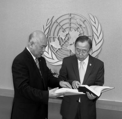 ▲蒋明君向联合国秘书长潘基文介绍《生态安全学导论》