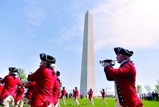 5月12日,在美国首都华盛顿,军乐队士兵在华盛顿纪念碑重新开放仪式上表演。