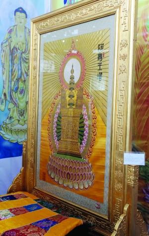 2008年在南京中华门外出土的七宝阿育王塔,一直备受关注。本次展会,南京云锦研究所带来了一件根据“塔王”制作的云锦七宝阿育王塔图。仔细看,织造的是“塔王”大光明王施首的那一面,和原件很接近。云锦七宝阿育王塔图采用桑蚕丝和金丝织成,和原件相比,加了莲花纹底座,佛光闪耀。