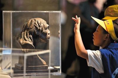 一名小朋友正用手比画“北京人”复原像。