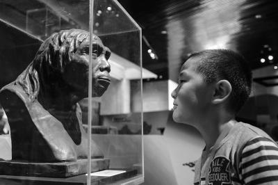图为一名小观众在周口店遗址博物馆新馆内与“北京人”对视。