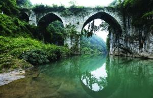 麻哈江水面23米高的上空中,静卧着52米长的葛镜桥。石桥两头,树木参天,花香四溢。与普通石拱桥不同,这是一座三孔尖拱石桥,桥梁两头分别立在距离水面6米高的悬崖石柱上,下方,几个直径不到20公分的小孔成为石桥的着力点。桥拱之上,平整的料石形如豆腐,层层堆砌。因此,葛镜桥也有“豆腐桥”之称。