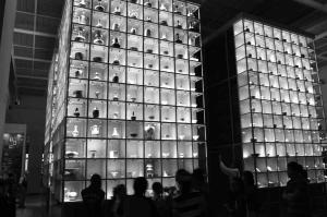 今年国际博物馆日的主题是“博物馆藏品架起沟通的桥梁”,南博除了开办主题展览外,还增设了体验和互动环节。主题展展厅被布置成黑、蓝、绿、红四种颜色,黑色代表艺术,展示历代书画作品、文房用具和案头雅玩;蓝色代表交流,如康熙时期外销瓷器的贸易品、受外国技艺影响的珐琅器、远播海外的漆器和瓷器;绿色代表生活,选取了表现强盛汉代生活的建筑和衣食住行类文物;红色代表生活,表现的是新石器时期。