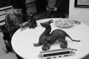 目前摆放的展品有十几件,主要是南博历史馆内展品的复制品,包括汉代的金兽、六朝时期的青瓷羊、汉代铜牛灯等。复制的比例是按照1:1的大小还原,在质地上,也是尽可能模仿了金属、瓷器的手感。