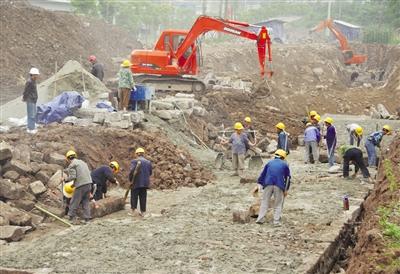 王斌介绍,古城墙复建工程从4月30日入场开工建设,目前正在进行基础设施建设。由于工期要求比较急,现场40多名工人正在趁着雨后晴朗的天气赶工期,预计这个月底完成全部基础施工。