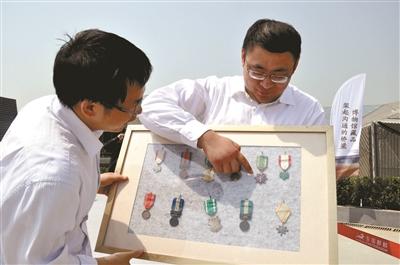 北京市民潘亦辉已经先后3次向抗战馆捐赠文物了。此次他捐赠了支那事变从军记章、瑞宝章、勋章、赤十字社章等12件文物。其中从军记章是由日本国家设立、颁发的战争和“出兵”行动纪念奖章。自1874年起,日本每次发动侵略战争或制造借口“出兵”他国,都会以日本帝国法令名义设计、制作一款从军记章,颁发给全体参加战争和“出兵”行动的军人。这些散落在我国民间的日军徽章,正是日军侵华的铁证。
