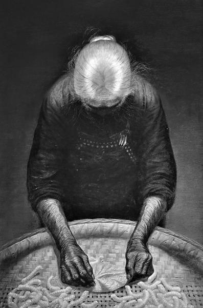 不过,与《父亲》着重刻画老人面部的沧桑不同,《春蚕》完全隐去了人物的面部,深色的背景加上头顶的光线投射,使得画面的焦点集中在母亲蚕丝般的满头银发上。鲜为人知的是,此次拍卖的《春蚕》与去年香港拍卖的那件其实也有细微差别,这幅画作中母亲胸前别着淡淡的蓝色花朵,而在去年上拍的画作中,母亲胸前是一朵鲜红的山茶花。