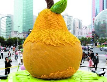 下图:一些游客在观赏徐家汇街头展出的残缺“鸭梨”。