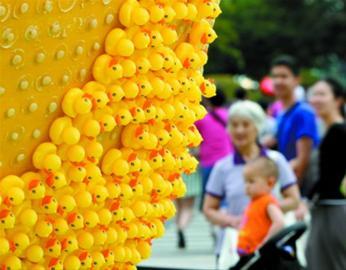 上海"鸭梨"由万只小黄鸭组成 不少被游客拔走(图)