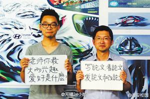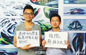 提问者——江南大学设计学院的“熊孩子”周申,回答者——他的导师、该院副院长张凌浩教授。师生二人举着题板、一问一答的创意合影,在周申上传到微博后,近日连续被@人民日报、@新华日报等众多媒体微博、校园微博转载,得到至少数千条网友评论。有网友赞道,老师太萌了,妥妥的是男神啊!