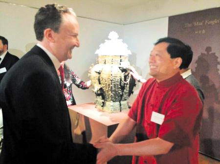 昨日,在美国纽约举行的皿方罍器身交接仪式上,湖南省博物馆馆长陈建明(右)与美方人员握手。老谭 摄