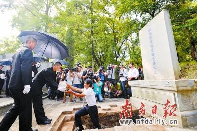 9时10分,司号者吹奏起安魂曲,在数千人的护送下,护灵者手捧骨灰罐缓缓走进国殇墓园中国远征军抗日阵亡将士纪念碑前,此时中国远征军抗日阵亡将士墓的地宫已经打开。阵亡将士的公祭活动就在纪念碑前举行,到场的海内外嘉宾已经将纪念碑前的广场全部占满。